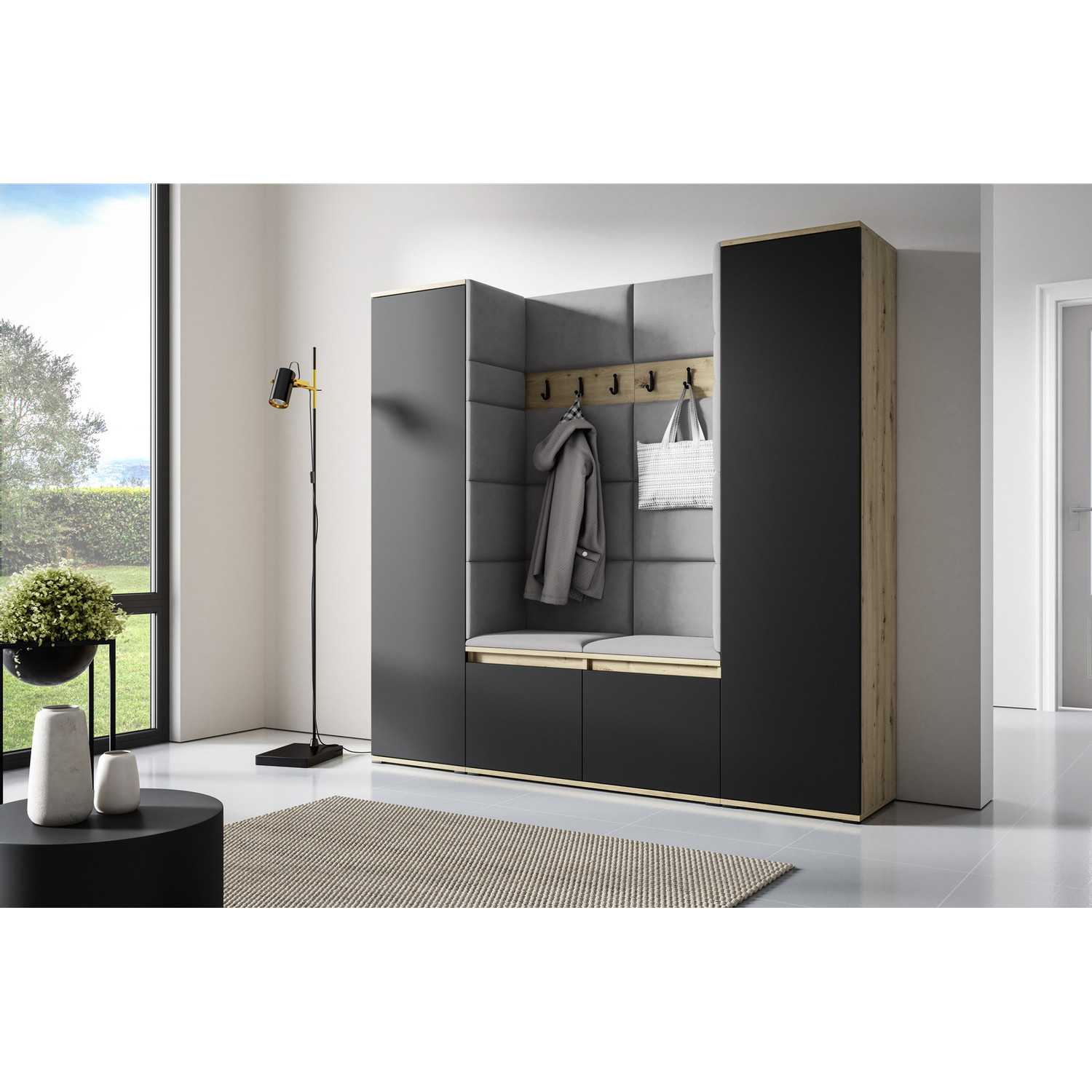 Popis produktu Predsieňová stena AMI 31 Bez zrkadla Dub artisan + čierna Sivá II