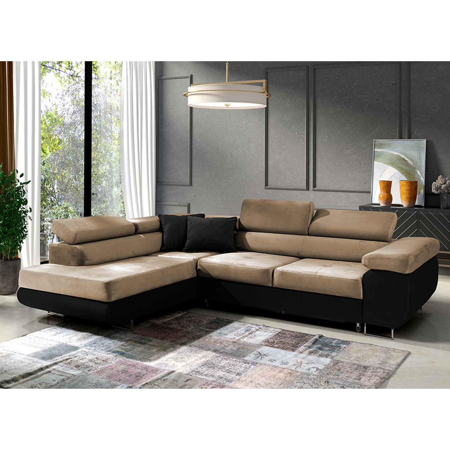 Popis produktu Rozkladacia rohová sedacia súprava 150 ETHAM Ľavá Béžová/čierna